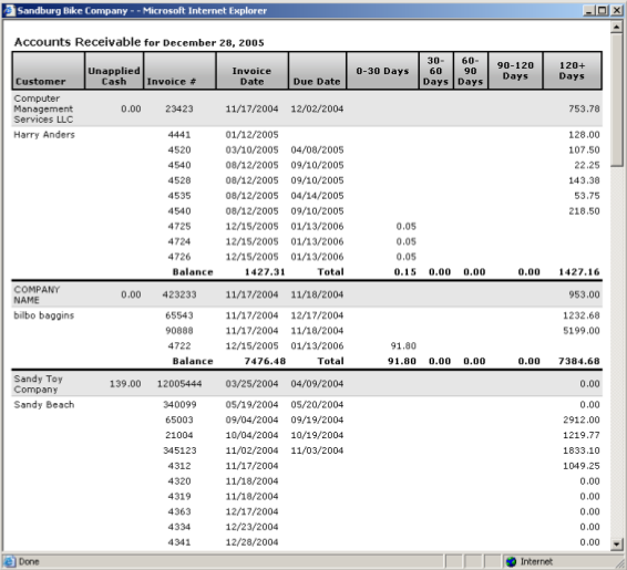 You can define aging periods either by days (0-30 days, 31-60 days, etc.) or by specific dates (3/16/1998 to 4/10/1998, 2/28/1998 to 3/15/1998, etc.). This is the date that is used to calculate the age of items. Items later than this date are not considered in calculating customer balances.