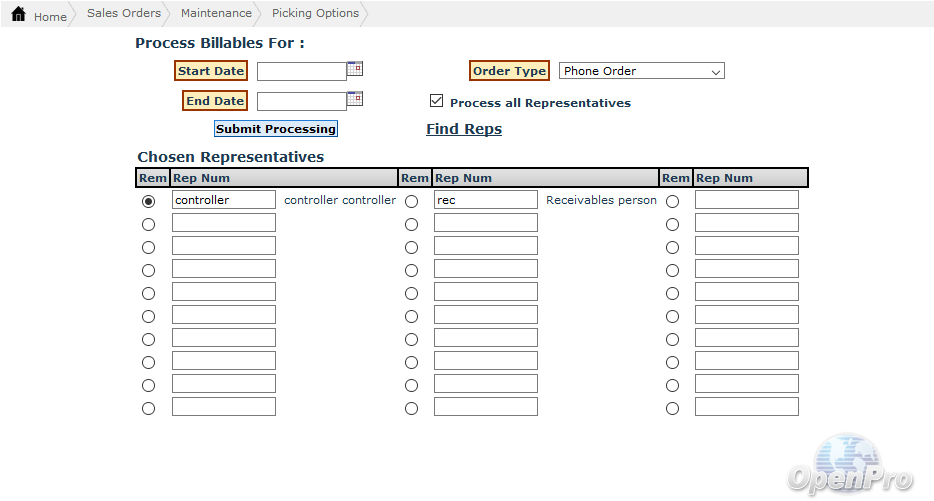 The Process Services screen allows you to process billables based on Start Date, End Date,Pick a date, order Type and sales representatives.