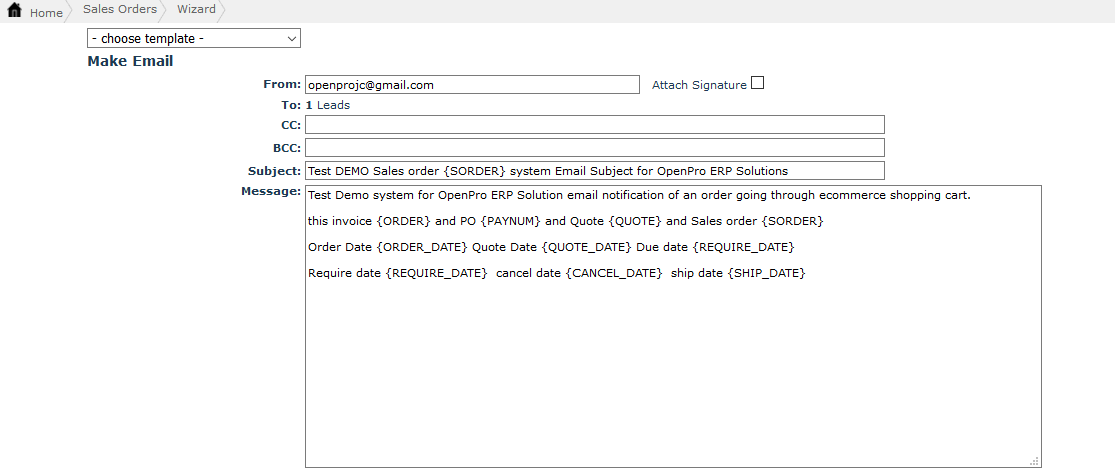 The Mass Email tab allows you to send an email to multiple customers at the same time. For examples, if you want to send a standard sales order complete email without creating afresh for each customer, you just need to select a template that will autopopulate your message body with a generic message.