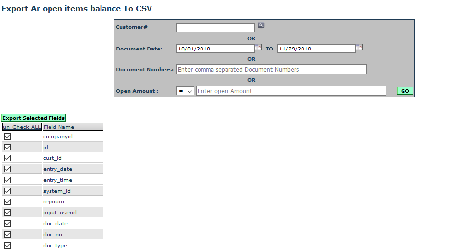 The upper part of the screen allows you to filter based on Customer number, Open Amount, Document Date and Document Numbers.