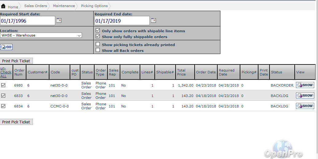 The Generate Pick Tickets Select Screen allows you to generate pick receipts for goods picked from the warehouse based on a defined criteria. You can generate pick receipts based on start, end dates and location. You also view the receipts by clicking the Show tab or print receipts by clicking Print Pick Ticket