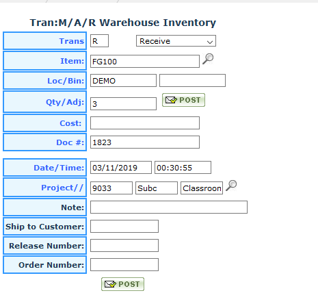 The Warehouse Inventory Transfer screen allows you to manage the inventory handling process from receiving, moving out and pending inventory.