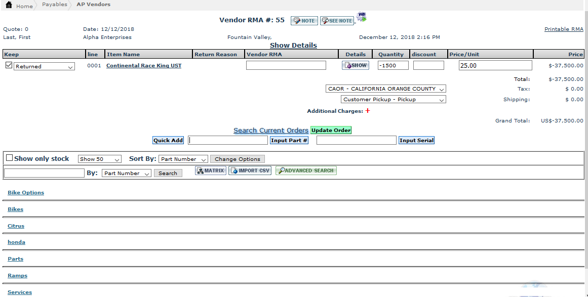The Vendor RMA Screen allows you to search for vendor return material authorization (VRMA) to allow you to return product received from a vendor.