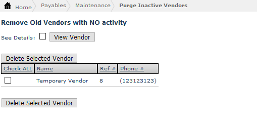 The Purge Inactive Vendors Screen allows you to remove all inactive vendors from the system. By checking the See Details functionality, you are able to see all the inactive vendors and you can choose whether to purge them by clicking Delete All Vendor Functionality.