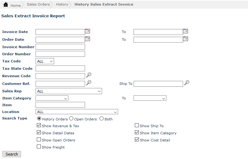 Search Type: Allows you to search for invoice report based on history, open orders or both
