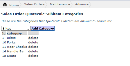 The Quotecalc Sub-item categories screen allows you to view and modify the sub-item categories that you can search for. While preparing an item sales order, you can only quote for the sub-items listed here while using the program.