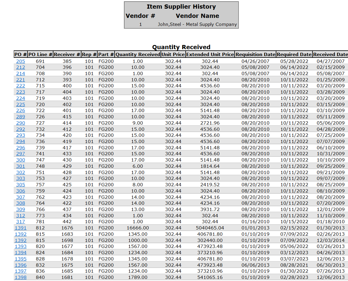 Vendor Inventory Supplier purchase order History This screen shows you the purchase orders created for this item, including the date purchased, required and actually received. You can drill down to the original purchase order to see details.