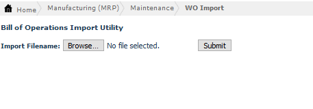 The WO Import screen allows you to import new/current Work Orders in CSV format. Once you Browse the file to import, click Submit to import.
