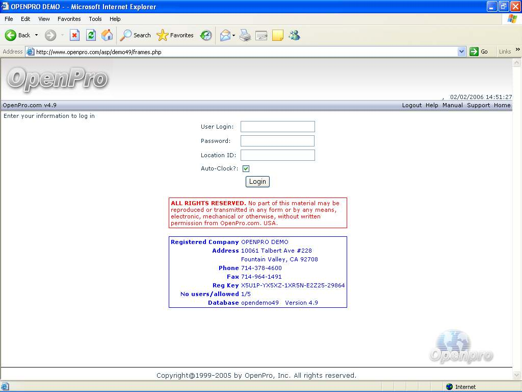 This section details the steps required to login to your evaluation copy of the OpenPro ERP software. This demo system works on any client from Windows 98, 2000, CE and XP, or Apple systems with browser or Linux operating systems.