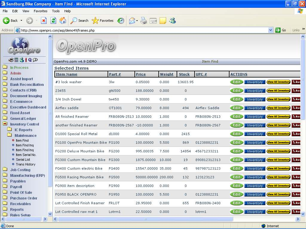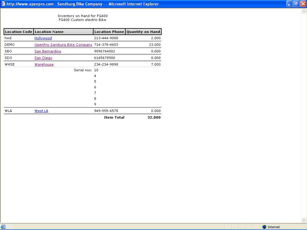 Here is the Show Inventory screen, displaying the current stock on hand. Additionally, you can see a drill down list of serialized items.