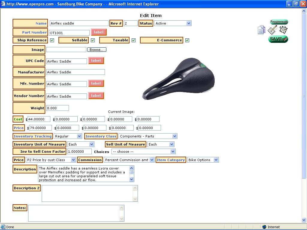 The OpenPro Standard Solution contains a number of fundamental features designed to simplify your use of the software. In this section, we describe those fundamentals in an effort to familiarize you with their use. Let’s look first at a sample Inventory Item screen, as shown below.